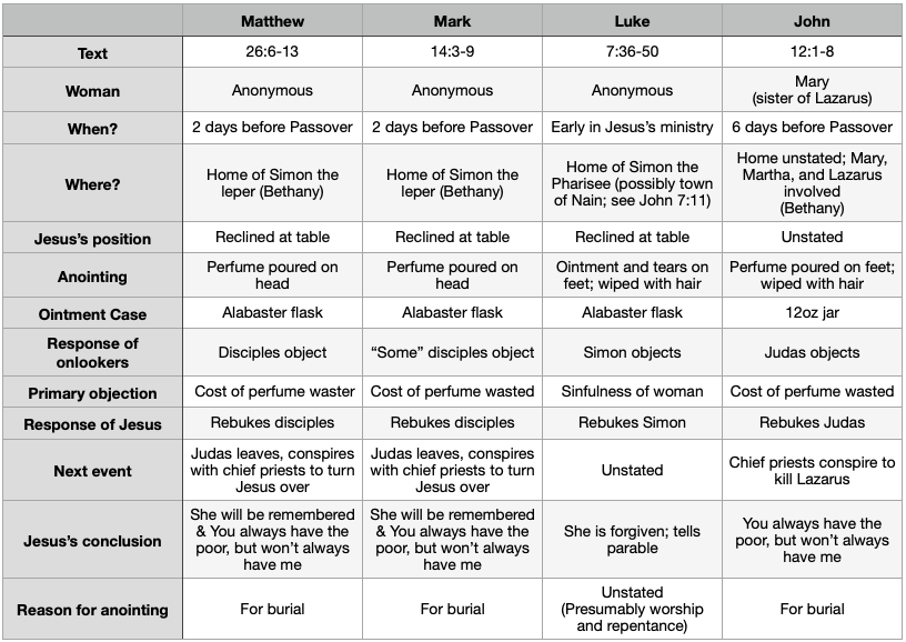 As I looked at some of the material on this particular story, it was clear that different authors have come to different conclusions about how many times Jesus was anointed in the gospels. For example, the popular website GotQuestions concludes that the gospels record three separate events. On the other hand, the ESV Study Bible notes conclude that Jesus was anointed only twice. Naturally, others have come to different conclusions even from these.