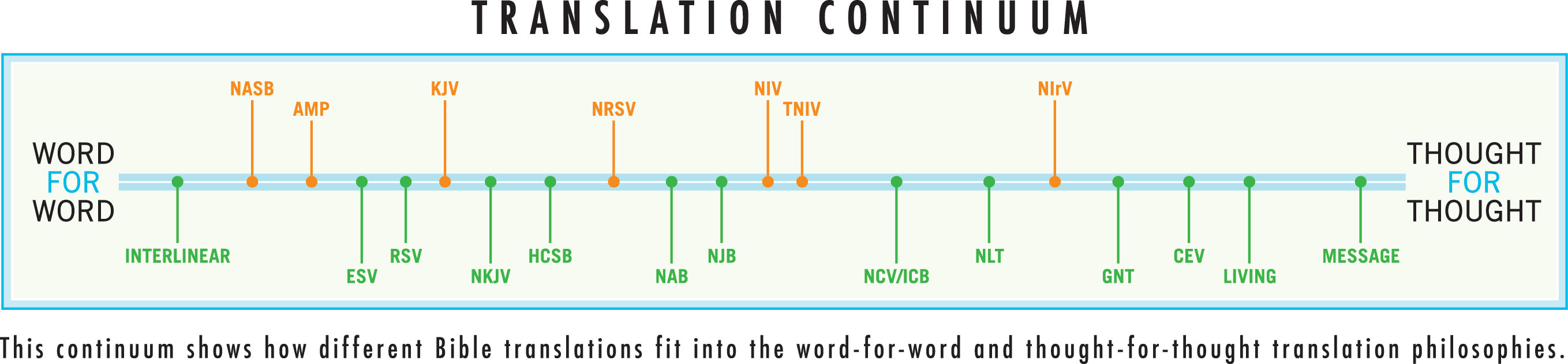 The chart below demonstrates roughly where several popular translations land in terms of being word-for-word or thought-for-thought in their approach.