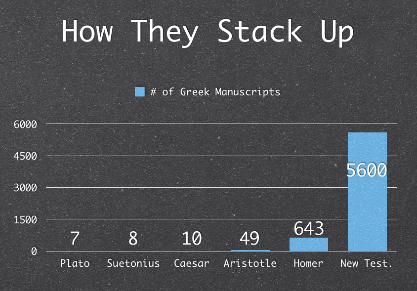 The New Testament has about 5,600 Greek manuscripts, or copies, to use in research. The next closest in Greek literature? Homer, with a whopping 643. Yes, read that sentence sarcastically. In fact, the writings of such highly touted philosophers like Plato and Aristotle have hardly anything of their own still kicking around, yet no one seems to question the authenticity or accuracy of their writings! If you include all of the manuscript evidence from the Old Testament as well, the number jumps up to the 25,000 range.
