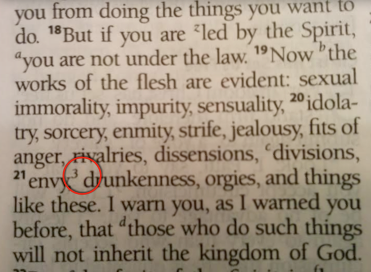 The first picture shows the text of Galatians 5:21, which clearly has a footnoted #3 next to the word “envy”. Skip down to the bottom of the page and notice the footnote says “some manuscripts add murder“. So, as scholars compared the manuscripts of Galatians, evidently some had the word “murder” listed in Galatians 5:21 while others didn’t. Scholars determined that omitting it was the most likely reflection of the original, but thought it was debatable enough to add the footnote that they could be wrong.